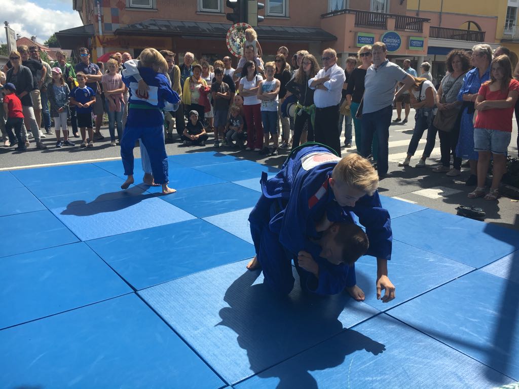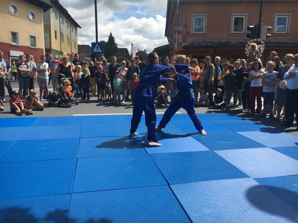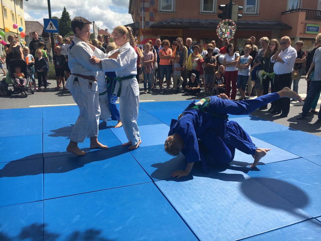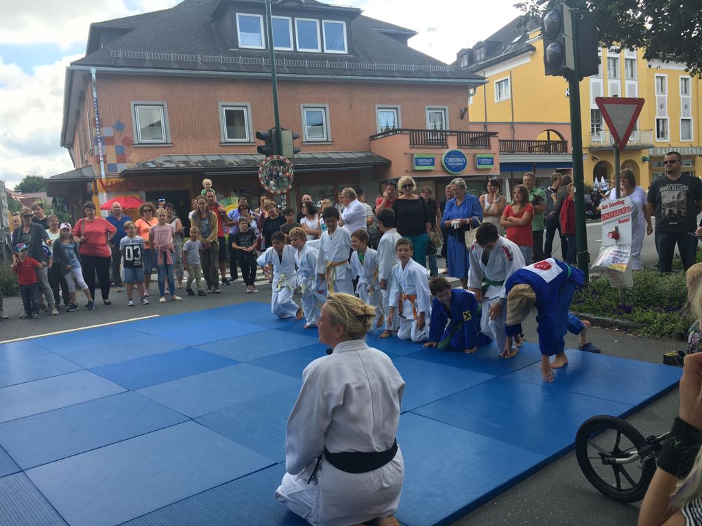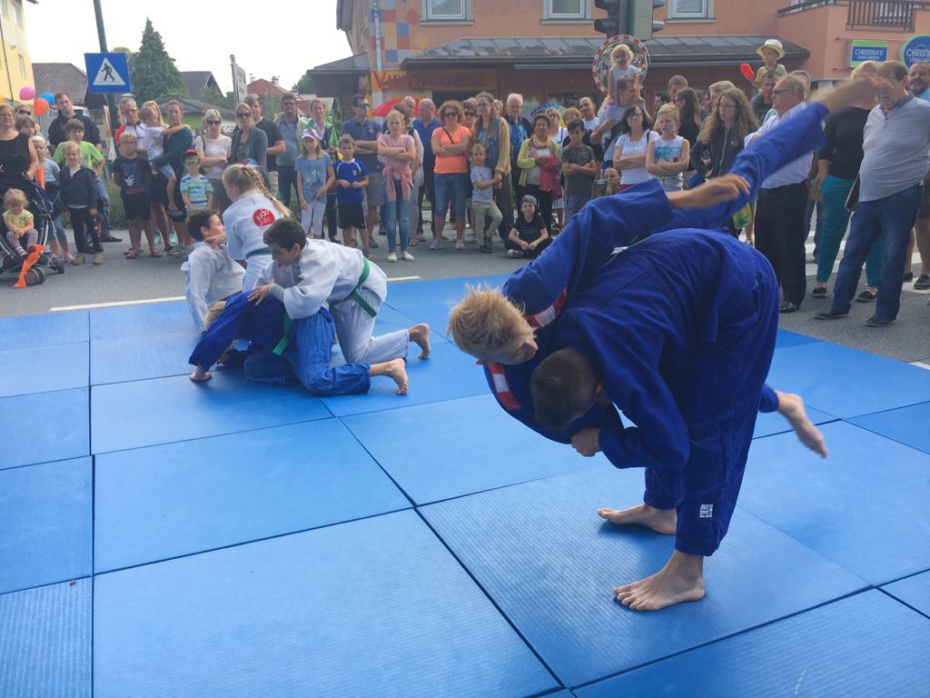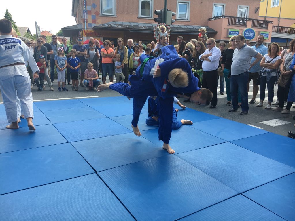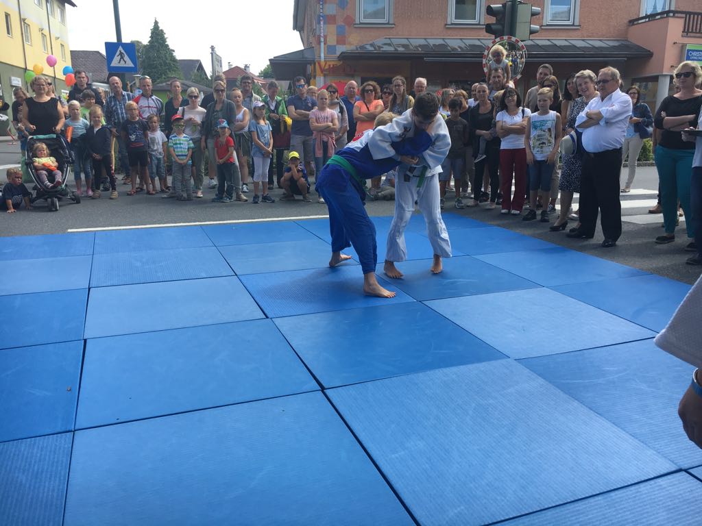 Erstmals waren wir heuer beim Straßwalchner Straßenfest dabei. Die Hauptstraße durch das Ortszentrum war gesperrt und wir konnten dort direkt unsere Mattenfläche für die beiden Judovorführungen auflegen. Viele Zuschauer beobachteten unsere kleinen und großen Judokas. Zur Stärkung gab es dann beim Burgertruck der Kronbergers leckere Kronburgers!
