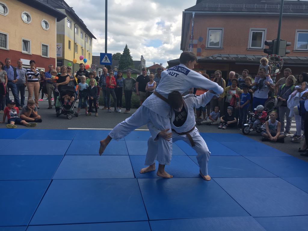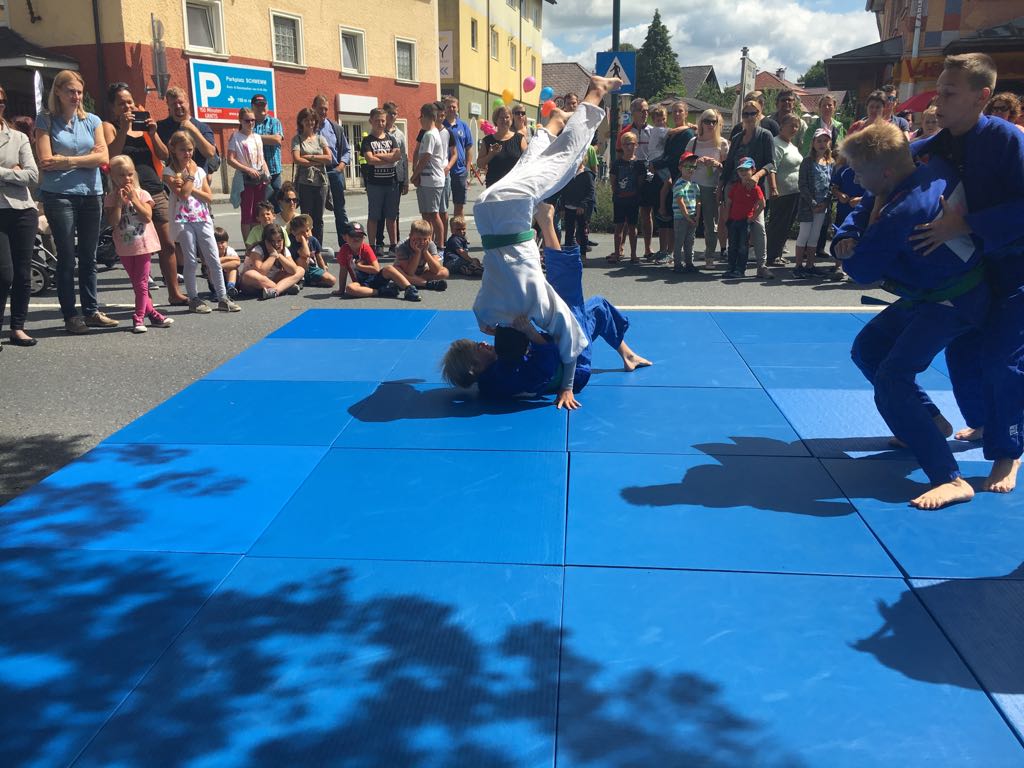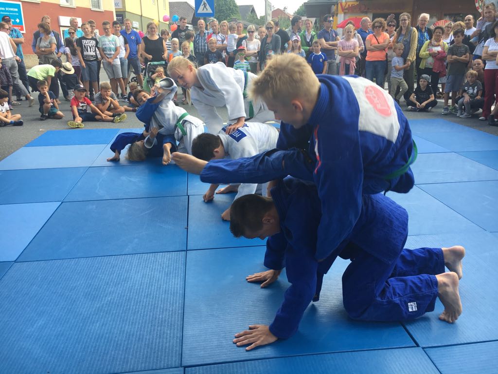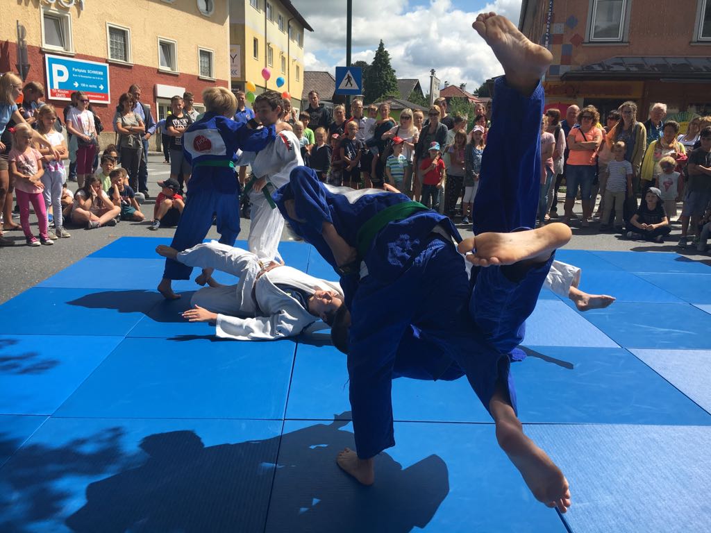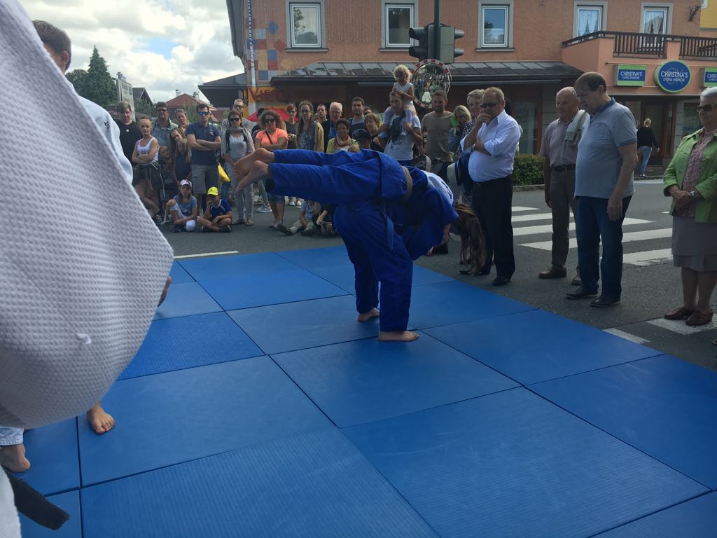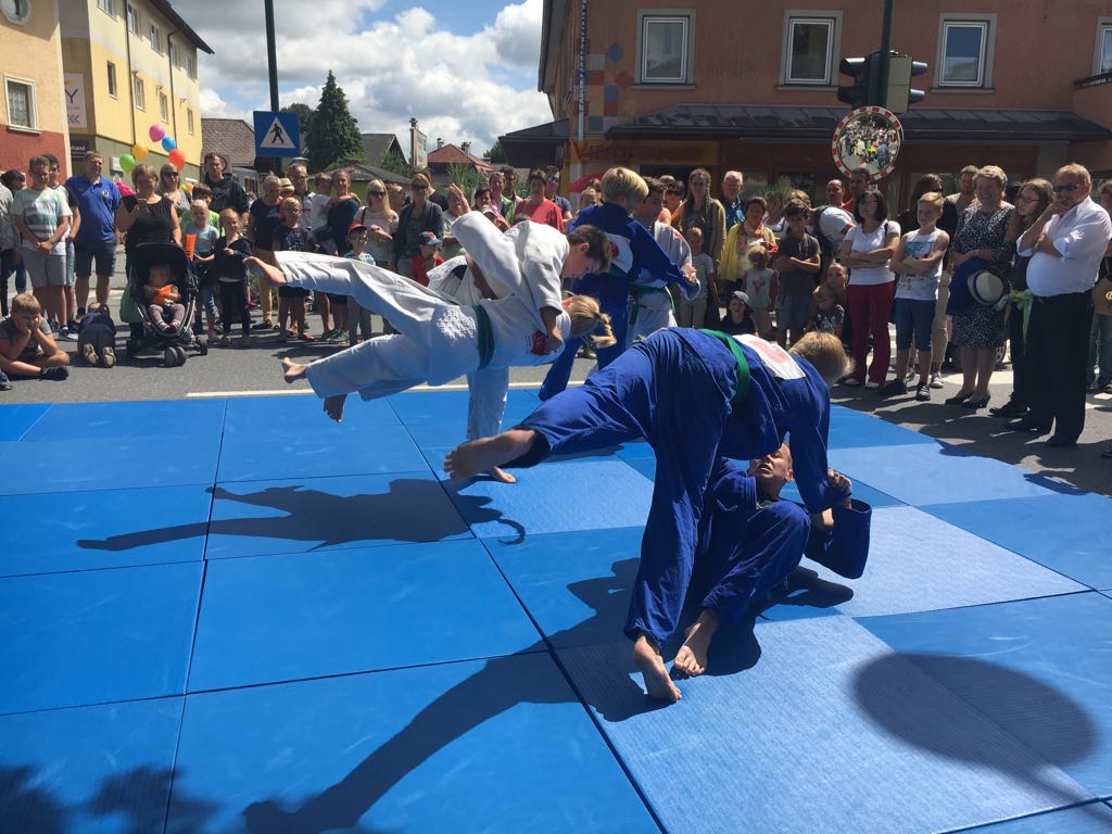 Erstmals waren wir heuer beim Straßwalchner Straßenfest dabei. Die Hauptstraße durch das Ortszentrum war gesperrt und wir konnten dort direkt unsere Mattenfläche für die beiden Judovorführungen auflegen. Viele Zuschauer beobachteten unsere kleinen und großen Judokas. Zur Stärkung gab es dann beim Burgertruck der Kronbergers leckere Kronburgers!