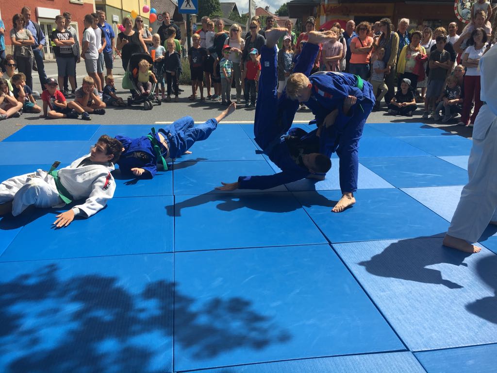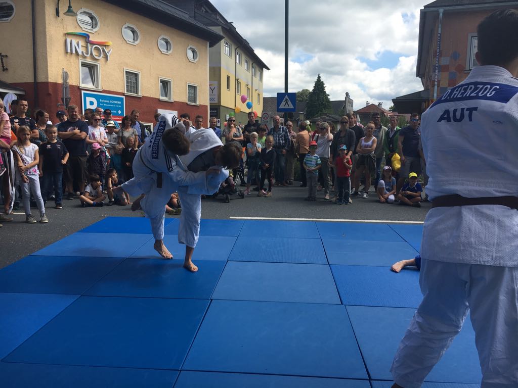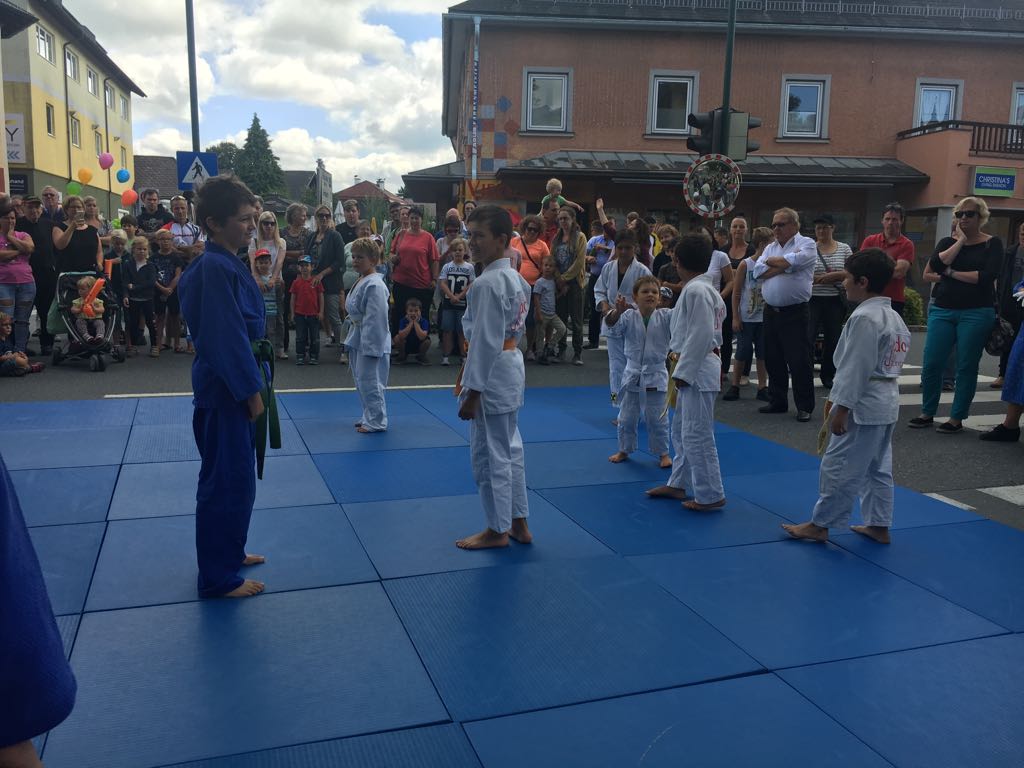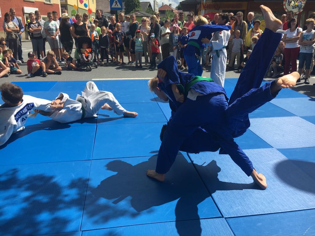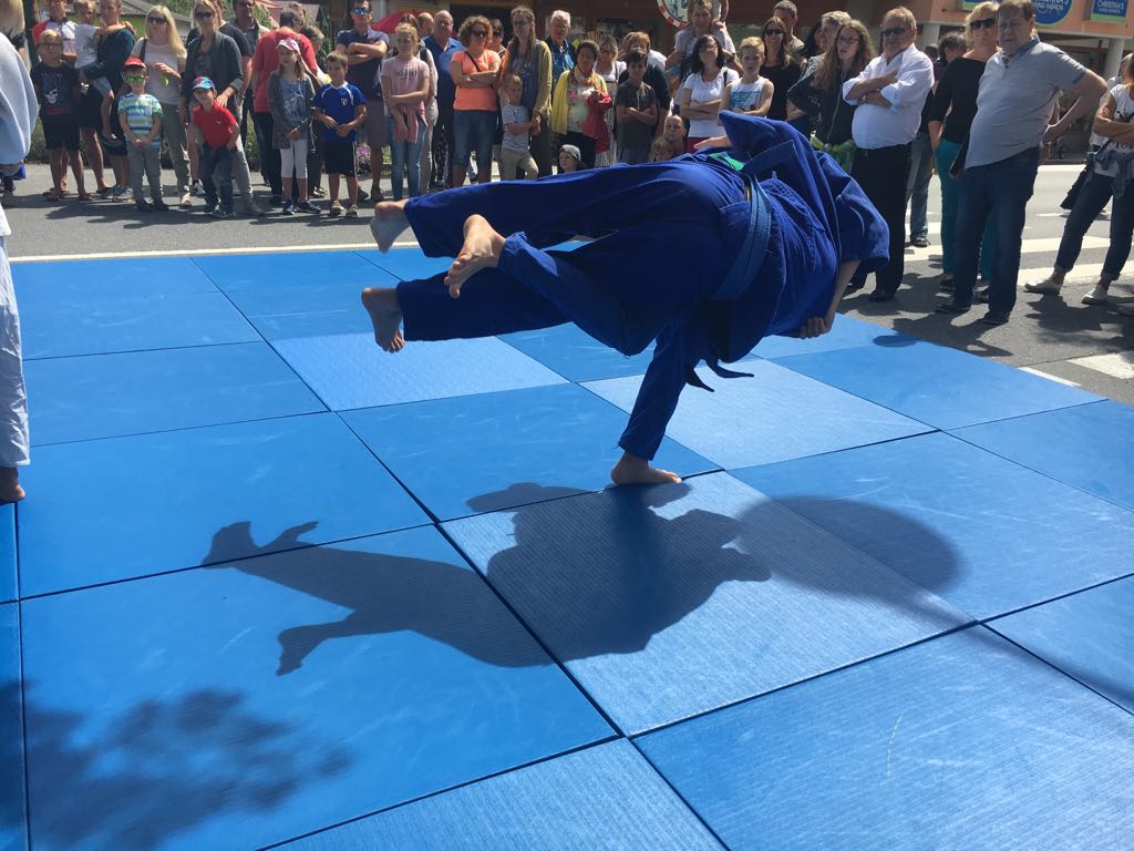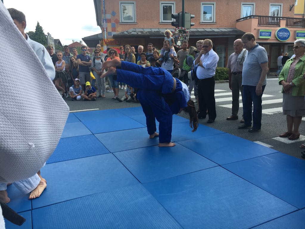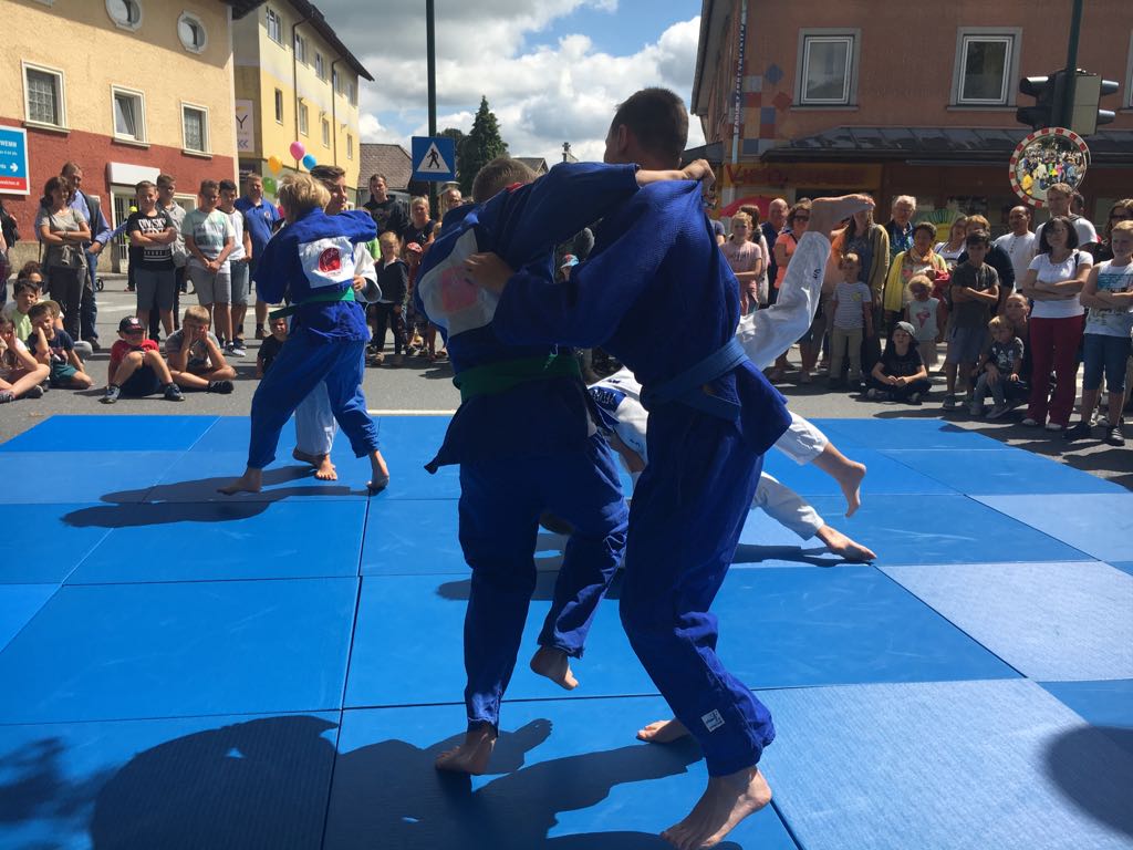 Erstmals waren wir heuer beim Straßwalchner Straßenfest dabei. Die Hauptstraße durch das Ortszentrum war gesperrt und wir konnten dort direkt unsere Mattenfläche für die beiden Judovorführungen auflegen. Viele Zuschauer beobachteten unsere kleinen und großen Judokas. Zur Stärkung gab es dann beim Burgertruck der Kronbergers leckere Kronburgers!