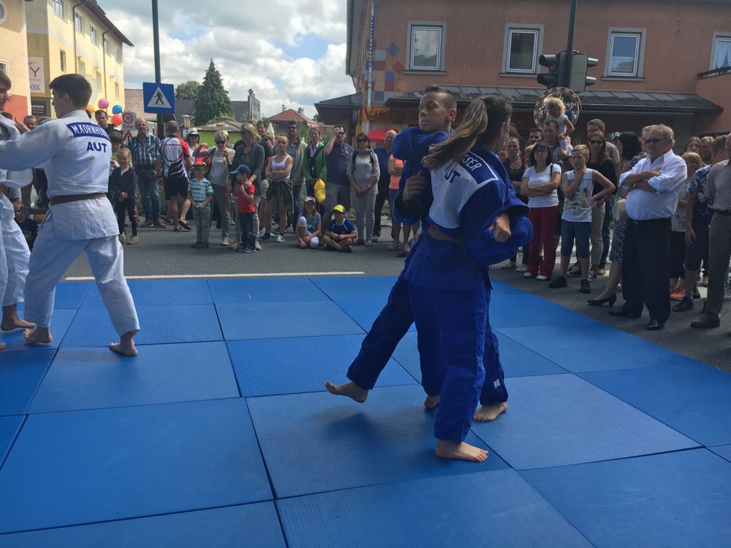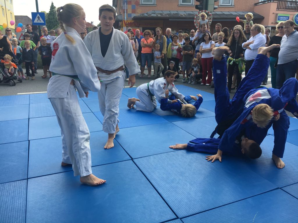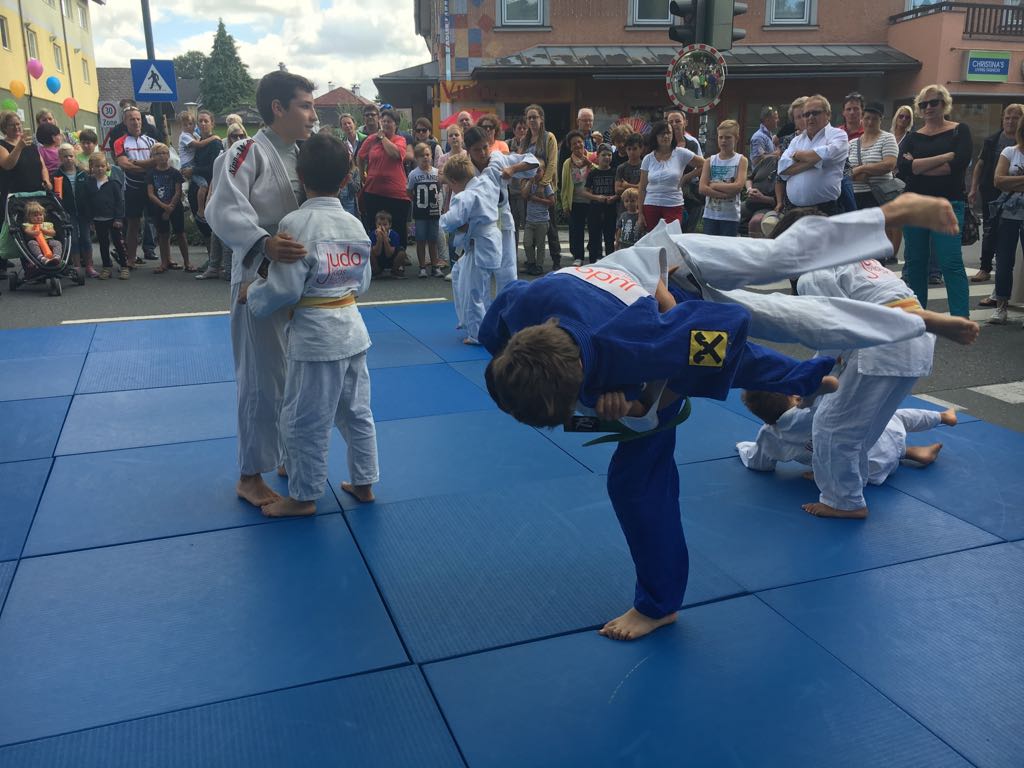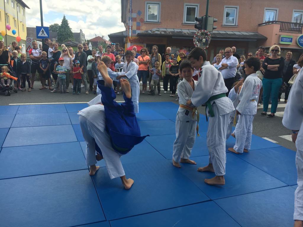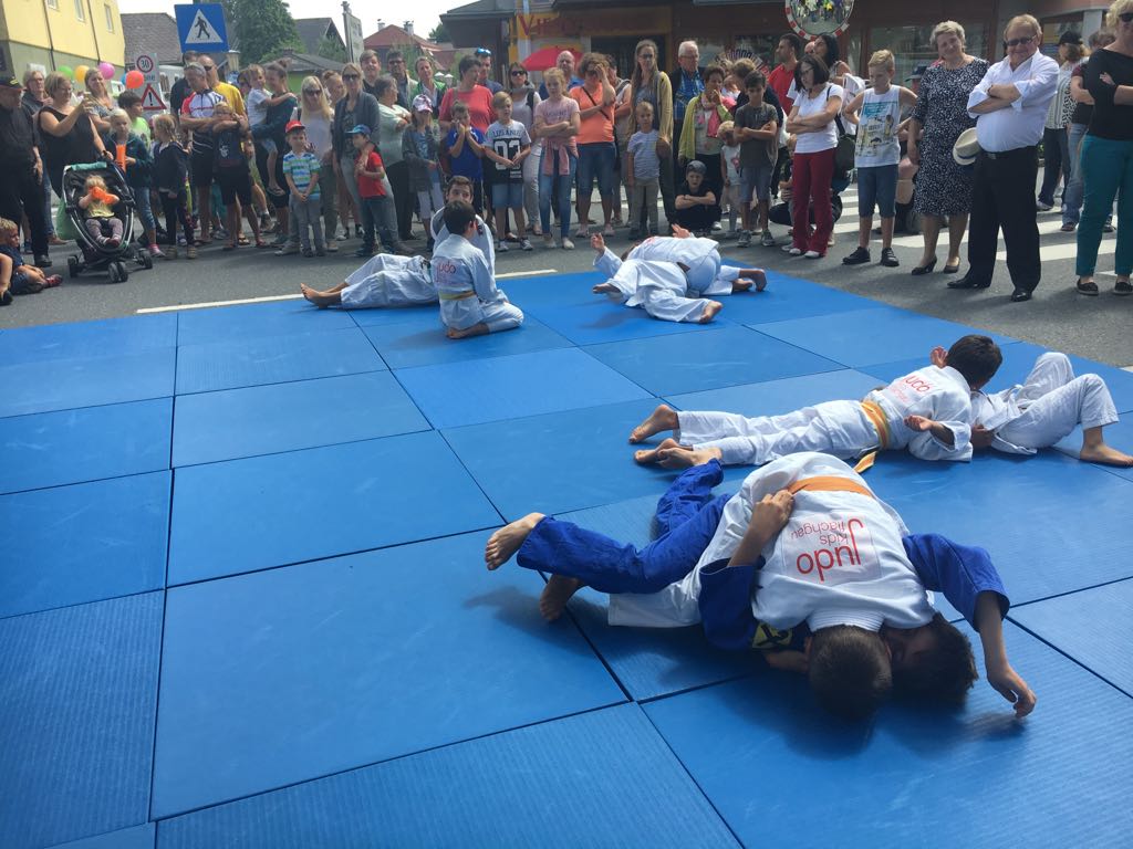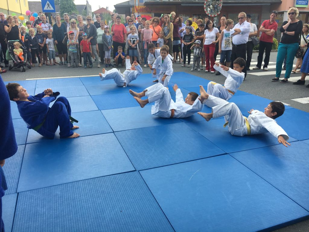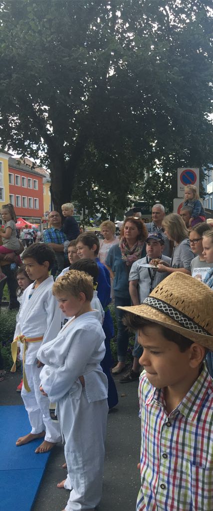 Erstmals waren wir heuer beim Straßwalchner Straßenfest dabei. Die Hauptstraße durch das Ortszentrum war gesperrt und wir konnten dort direkt unsere Mattenfläche für die beiden Judovorführungen auflegen. Viele Zuschauer beobachteten unsere kleinen und großen Judokas. Zur Stärkung gab es dann beim Burgertruck der Kronbergers leckere Kronburgers!