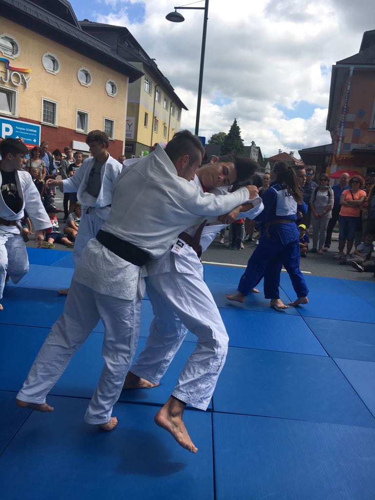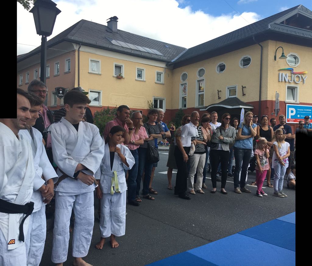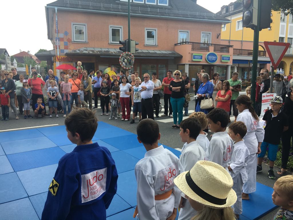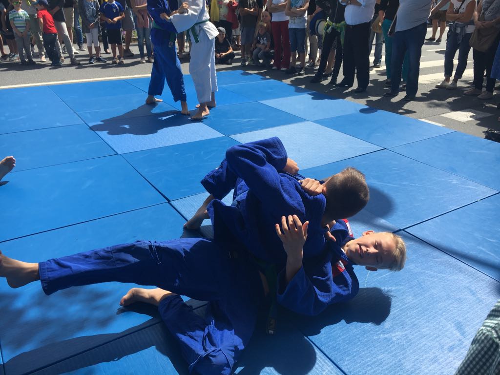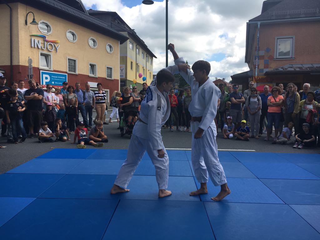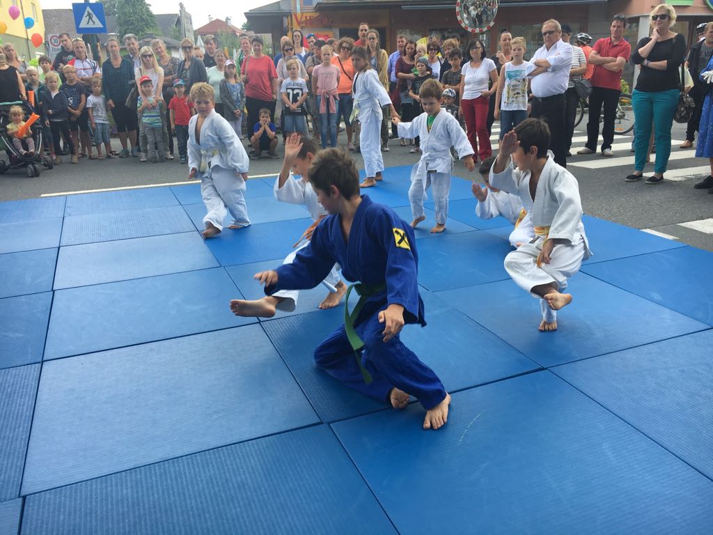 Erstmals waren wir heuer beim Straßwalchner Straßenfest dabei. Die Hauptstraße durch das Ortszentrum war gesperrt und wir konnten dort direkt unsere Mattenfläche für die beiden Judovorführungen auflegen. Viele Zuschauer beobachteten unsere kleinen und großen Judokas. Zur Stärkung gab es dann beim Burgertruck der Kronbergers leckere Kronburgers!