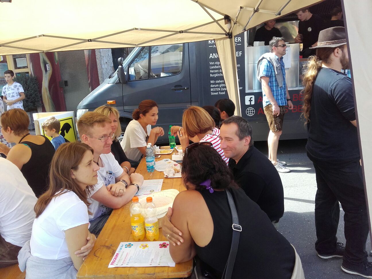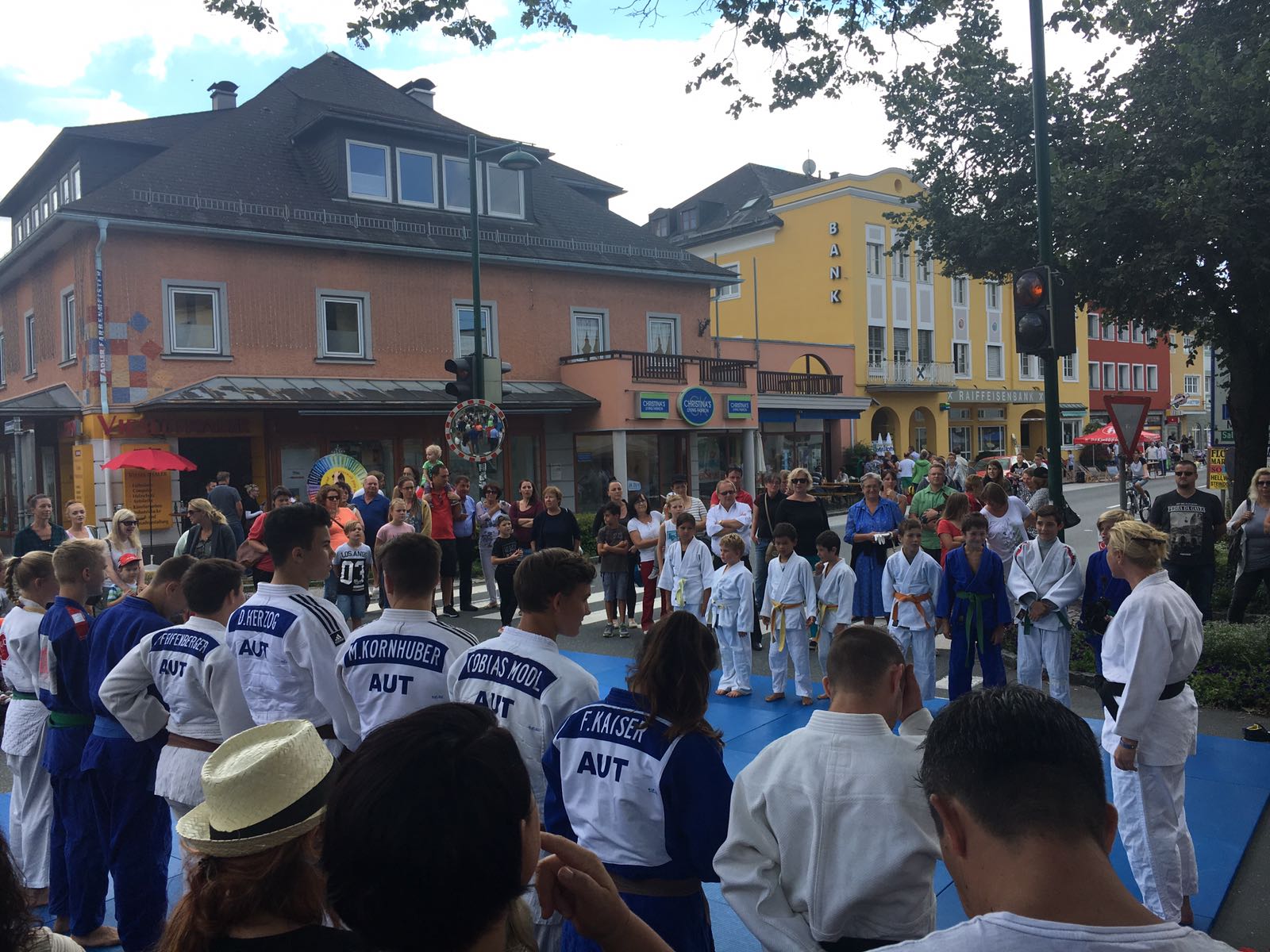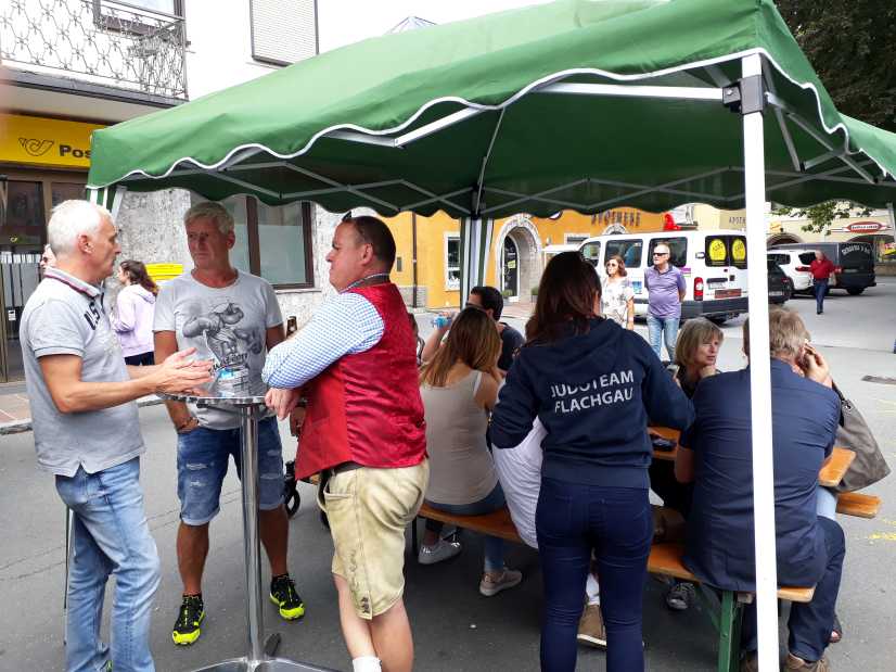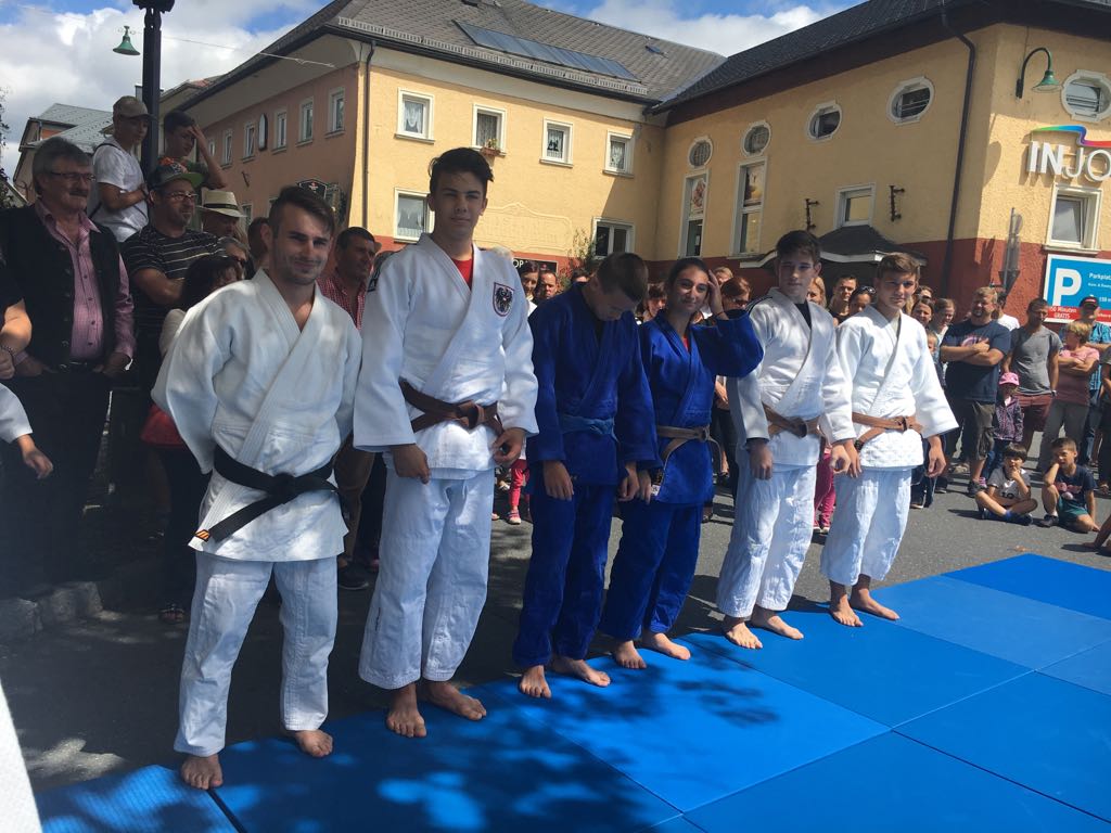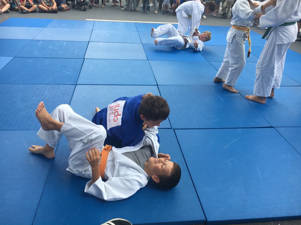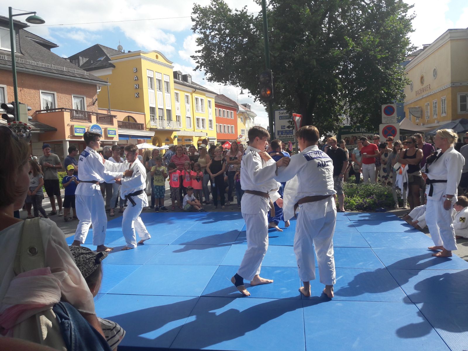 Erstmals waren wir heuer beim Straßwalchner Straßenfest dabei. Die Hauptstraße durch das Ortszentrum war gesperrt und wir konnten dort direkt unsere Mattenfläche für die beiden Judovorführungen auflegen. Viele Zuschauer beobachteten unsere kleinen und großen Judokas. Zur Stärkung gab es dann beim Burgertruck der Kronbergers leckere Kronburgers!
